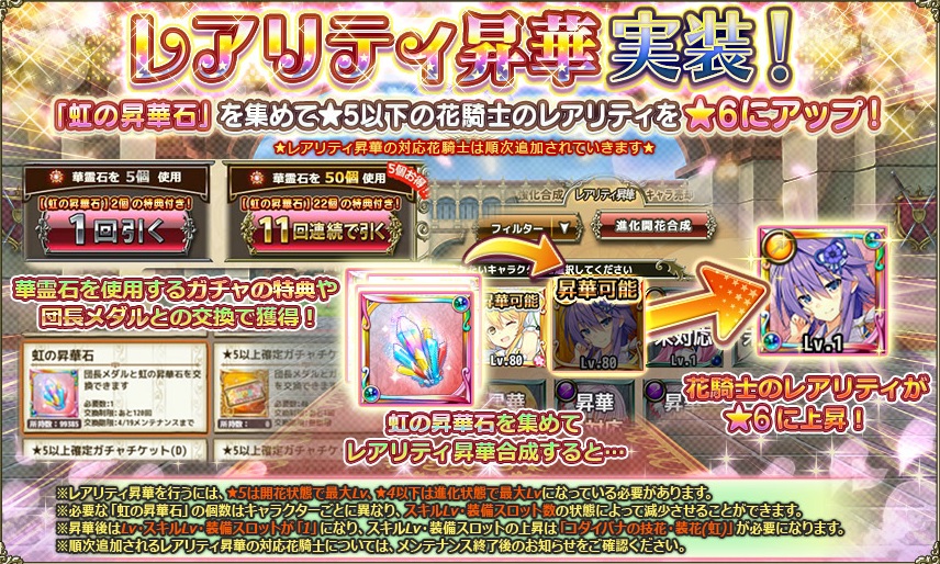 レアリティ昇華に対応した★2~★5のキャラクターのレアリティを★6に上昇させることができる。